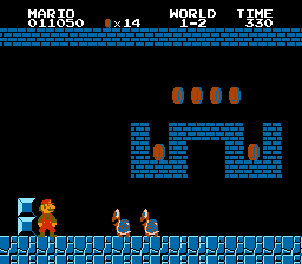 限られた色とドット数の中で、マリオのヒゲや帽子、つなぎまでしっかり描き分けられているのは驚き。敵キャラや背景もシンプルながら印象的で、一目で覚えられるデザインが揃っています。